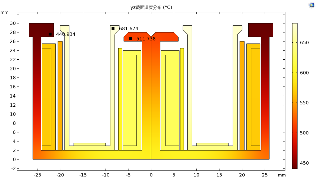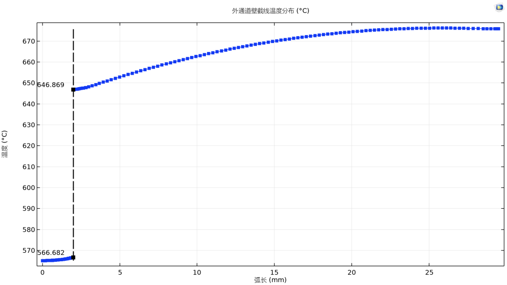 绘制这个截线上的温度数值。由图可见,在连接处,温度从 566.682°C 跃升至 646.869°C,并且并不连续。这其实与先前的接触热阻定义方式直接关联。当规定了“等效薄层热阻”的层热导流率,软件在解算傅里叶导热定律$\vec{Q} = -k \nabla T$时,在稳态下热流密度Q需连续,而k在界面突变,必然导致温度梯度调整,最终表现为温度T在界面处不连续。
